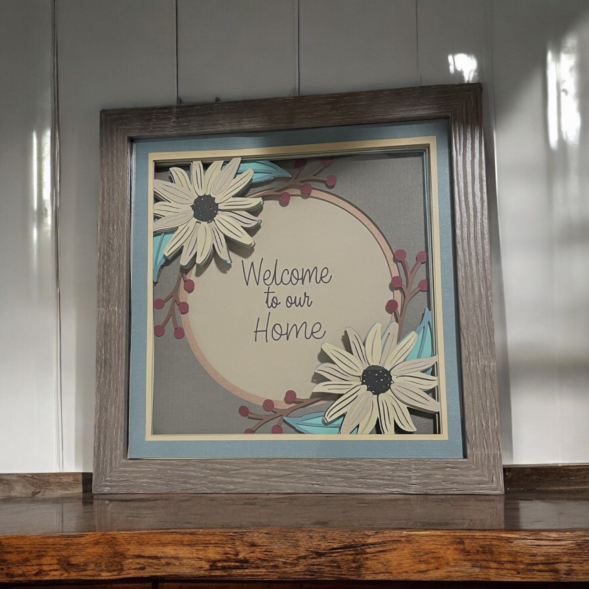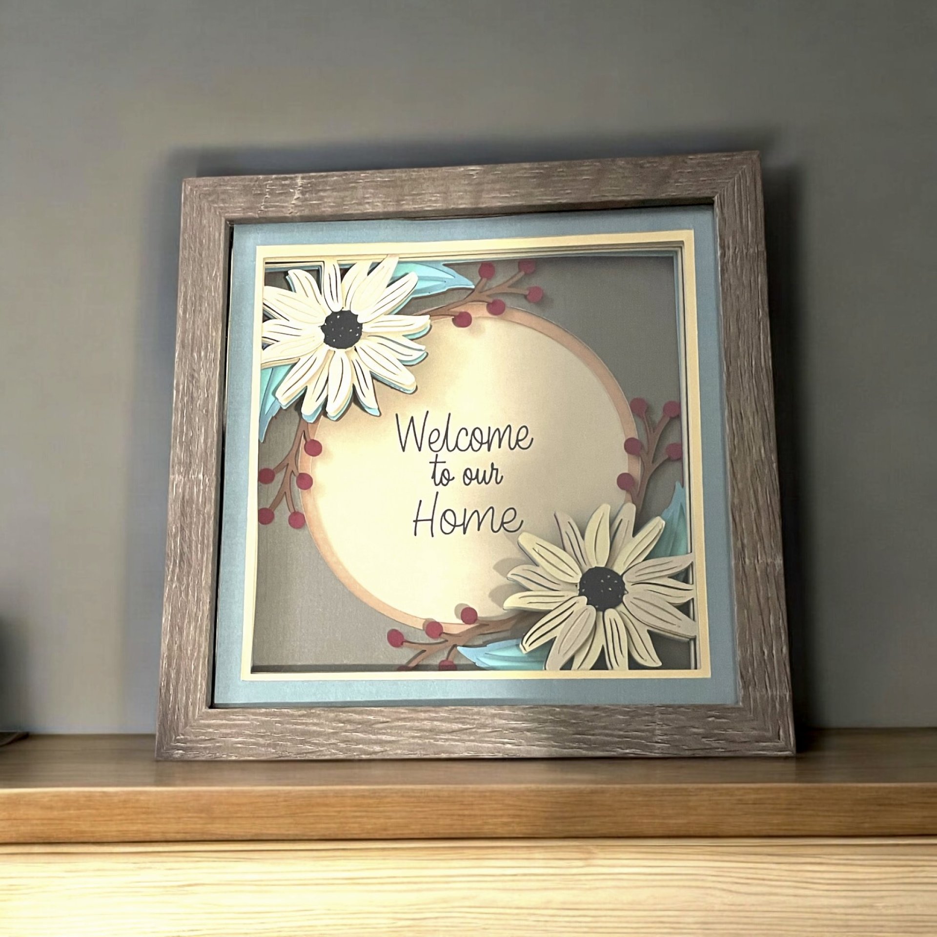 Featuring an two flowers surrounding the saying "Welcome to our Home," in neutral shades, with a light brown wood frame. Hand crafted from multiple layers of cardstock, which create depth, making it 3 dimensional. Frame measures 8 x 8, with a bracket on the back for easy hanging.