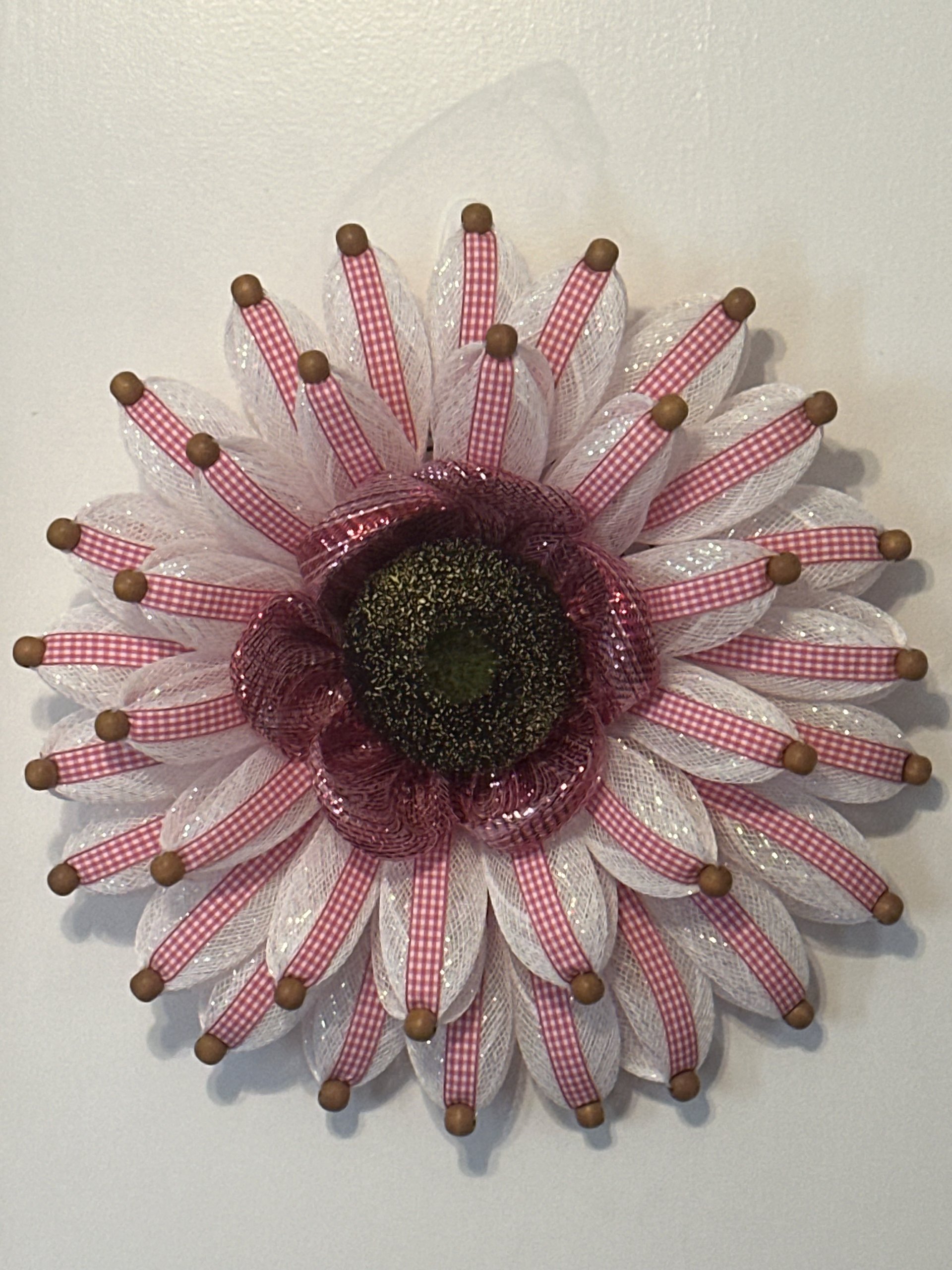 Brighten up your space with this charming daisy petal wreath! Adorned with delightful white and pink gingham ribbon, it's beautifully accented with beads that add a touch of whimsy. Perfect for bringing a pop of color and cheer to any room!