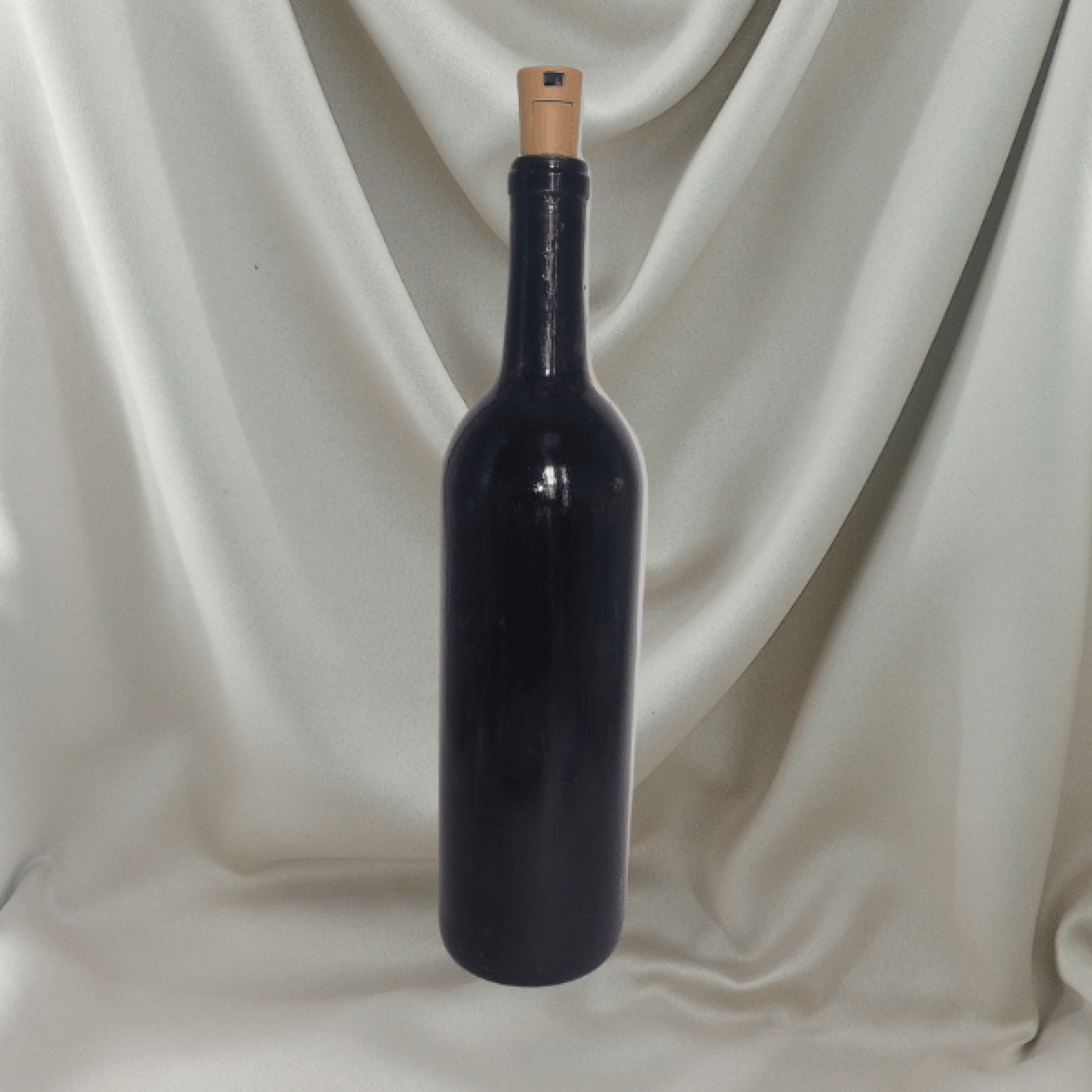 This wine bottle vase has been intricately designed and hand painted, featuring a wooden cross draped with white linen. It comes with a cork with Fairy Lights which light the bottle from the inside.