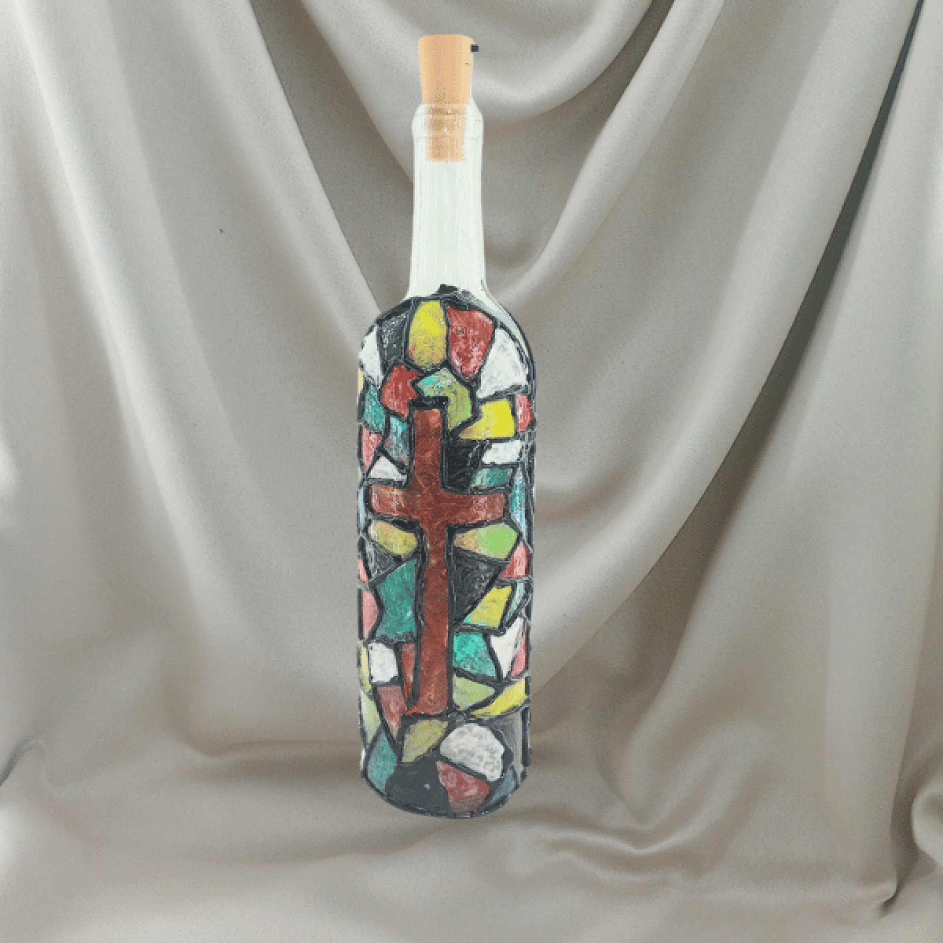 This wine bottle vase has been intricately designed and hand painted, with a Faux Stained Glass. It features a painted wooden cross. It comes with a cork with Fairy Lights which light the bottle from the inside.