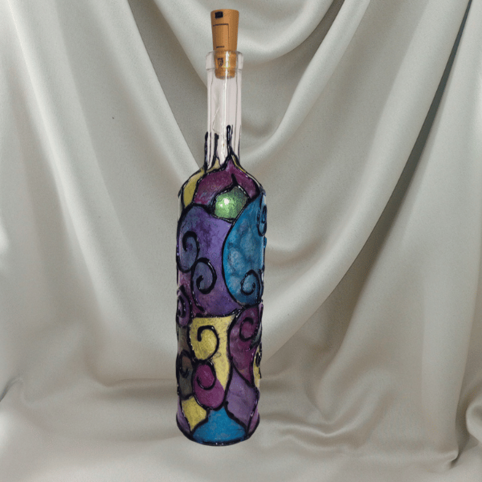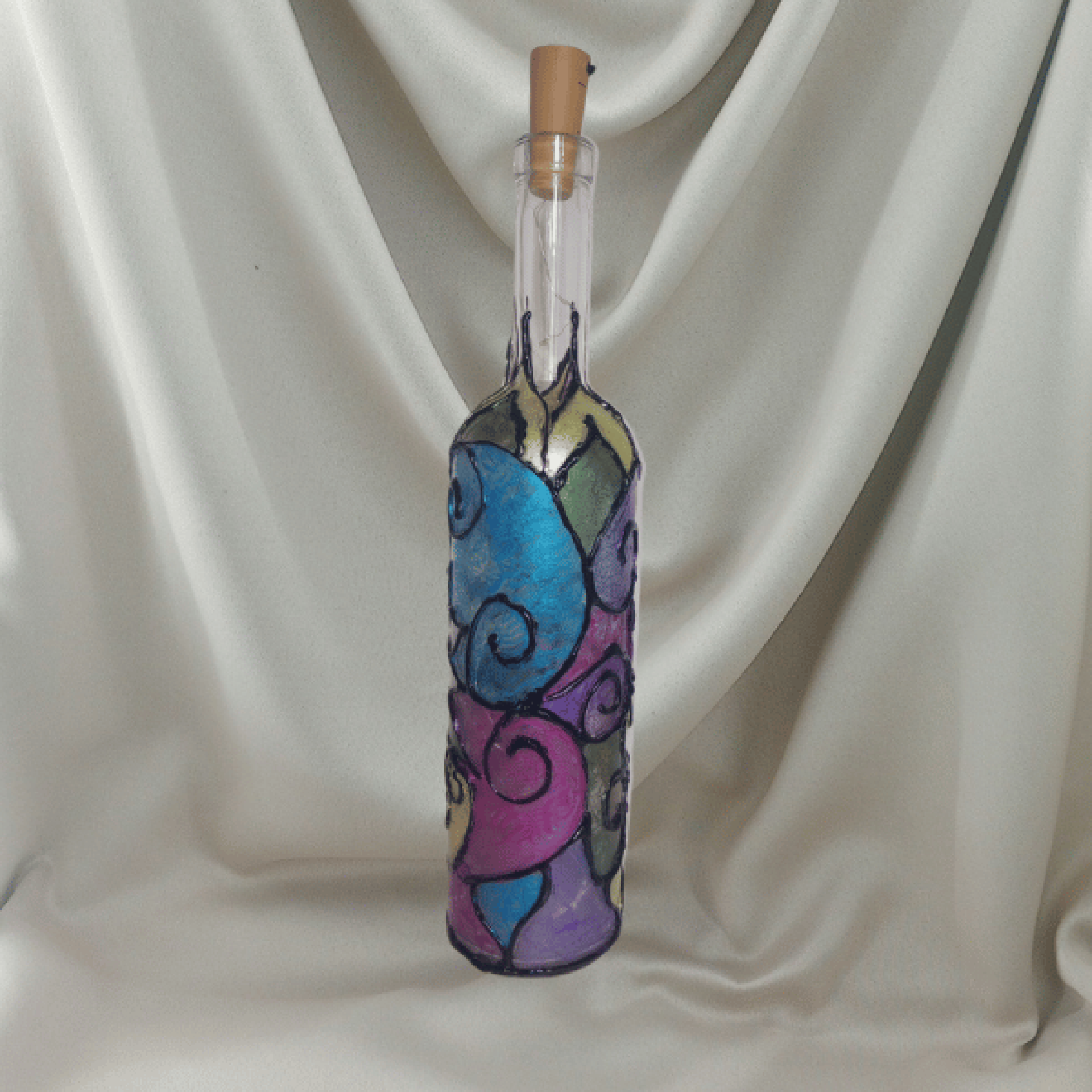 This wine bottle vase has been intricately designed and hand painted with Faux Stained Glass designed, surrounding a Lotus Flower. It comes with a cork with Fairy Lights which light the bottle from the inside.