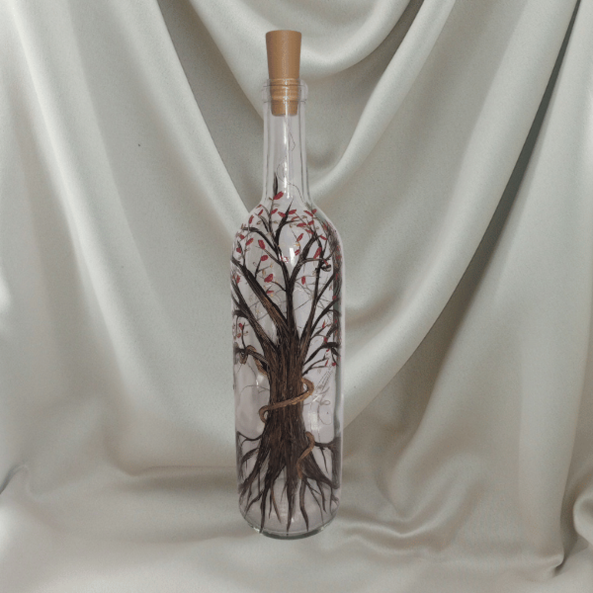 This wine bottle vase has been intricately designed and hand painted with the Tree of Life. It comes with a cork with Fairy Lights which light the bottle from the inside.