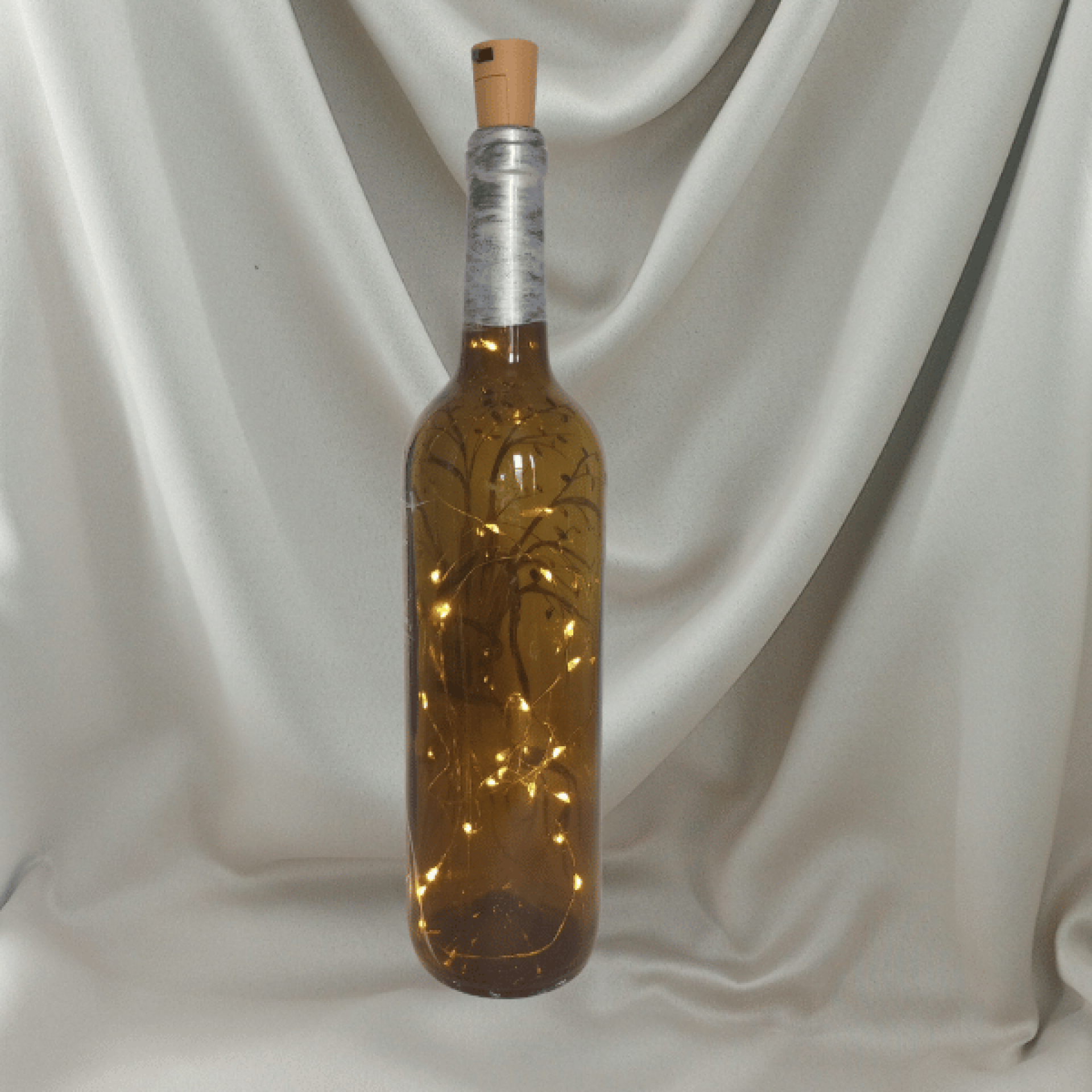 This wine bottle vase has been intricately designed and hand painted with the Tree of Life. It comes with a cork with Fairy Lights which light the bottle from the inside.
