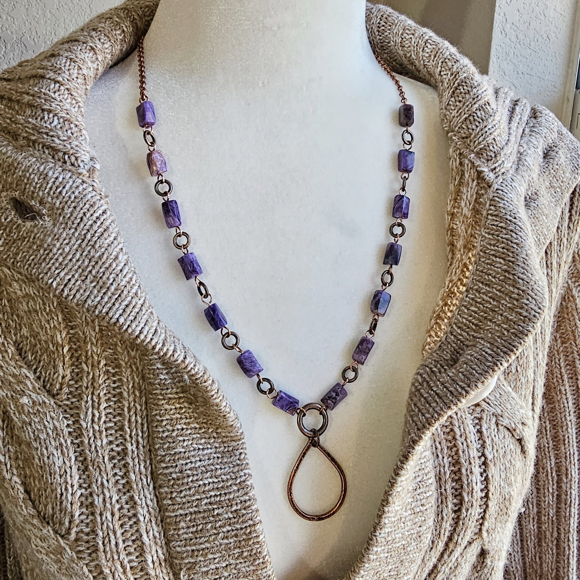 This necklace pairs natural cut charoite stones with an antiqued copper pendant a classic, rustic, beautiful combination. It hangs on copper chain about 24 long not including the pendant. The hook clasp is handcrafted using quality copper wire.