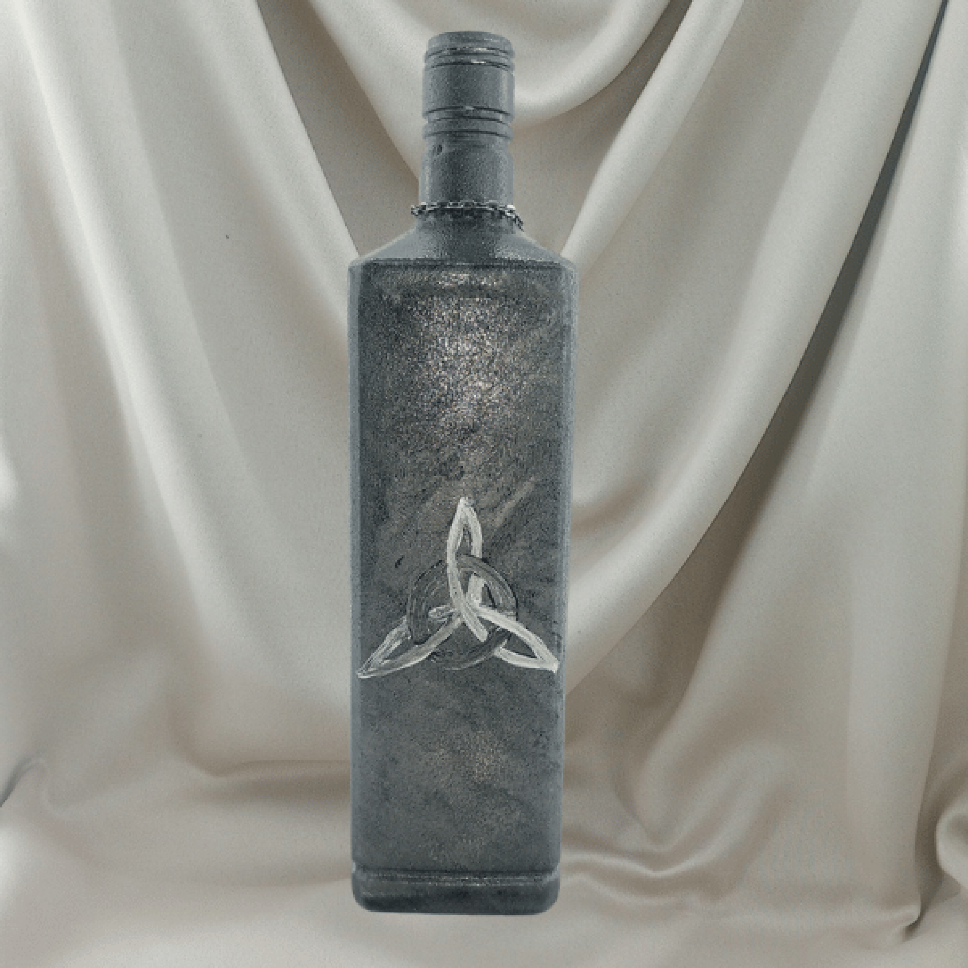This particular bottle has been artistically designed with a faux metal effect complimenting the Norse theme. The front of the bottle is adorned with the hand painted Ancient NOrse Viking Symbol ÆGISHJÁLMR, which is also known as The Helm of Awe. It is a commonly known divine symbol of protection and victory. The back of the bottle is adorned with the Norse Triquetra symbol, which is also known as a "Trinity Knot," typically represents the concept of eternal spiritual life, with no beginning or end, often associated with the three aspects of a goddess (maiden, mother, crone) or the interconnectedness of the past, present, and future; it can also be interpreted as symbolizing the three realms of Norse mythology: Asgard, Midgard, and Utgard.