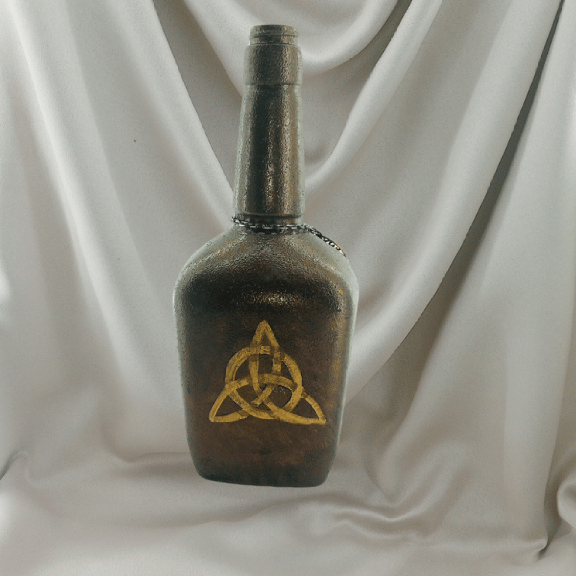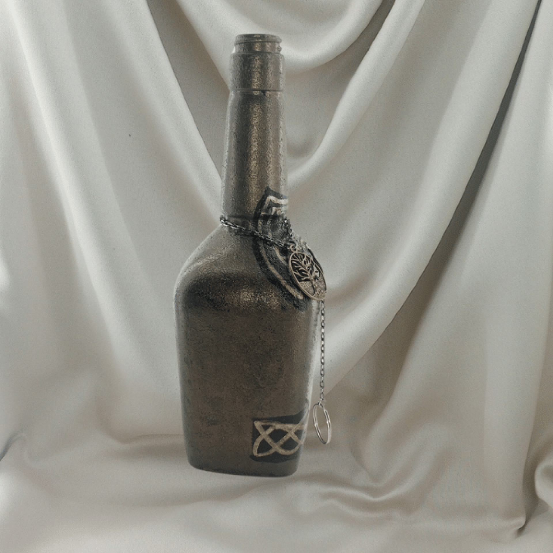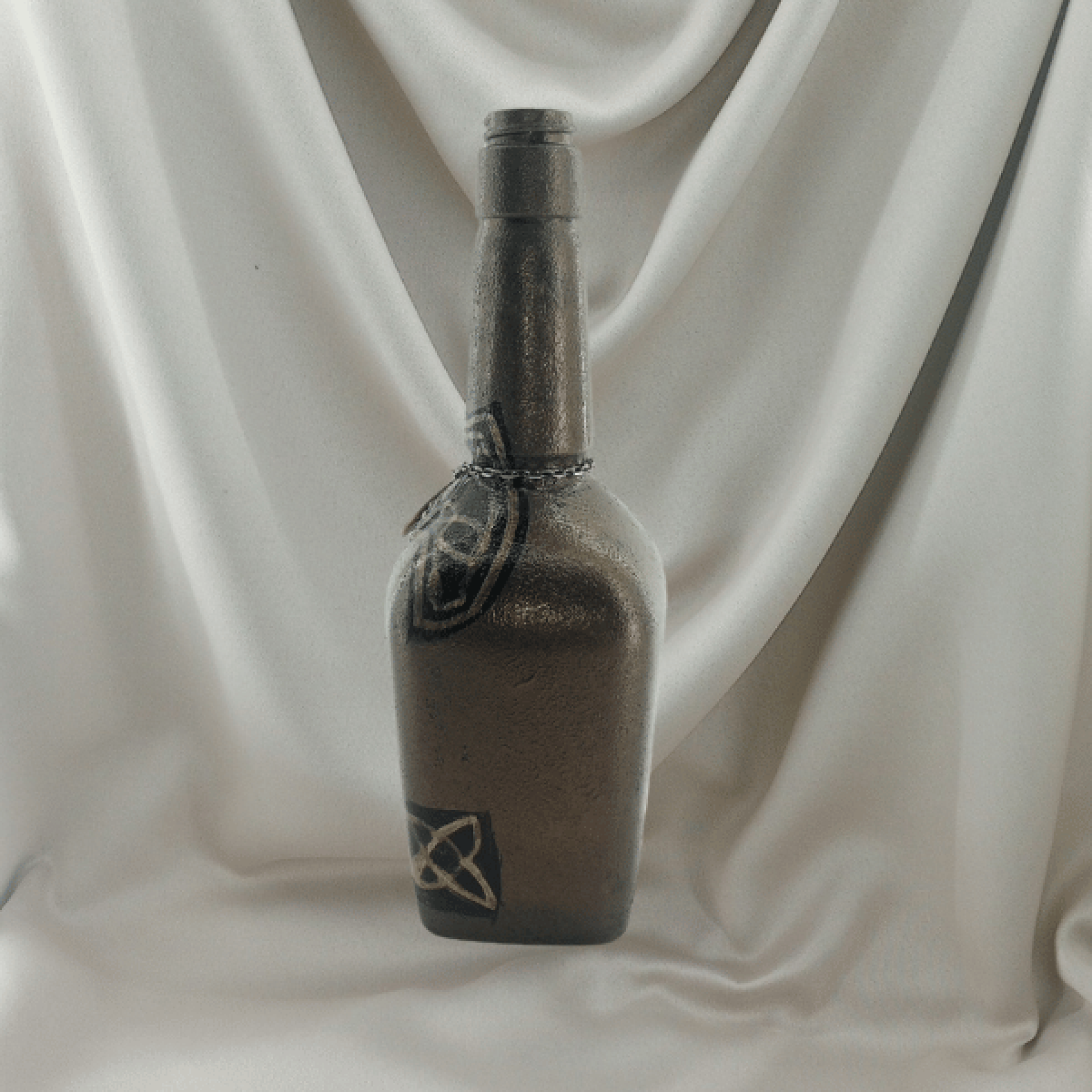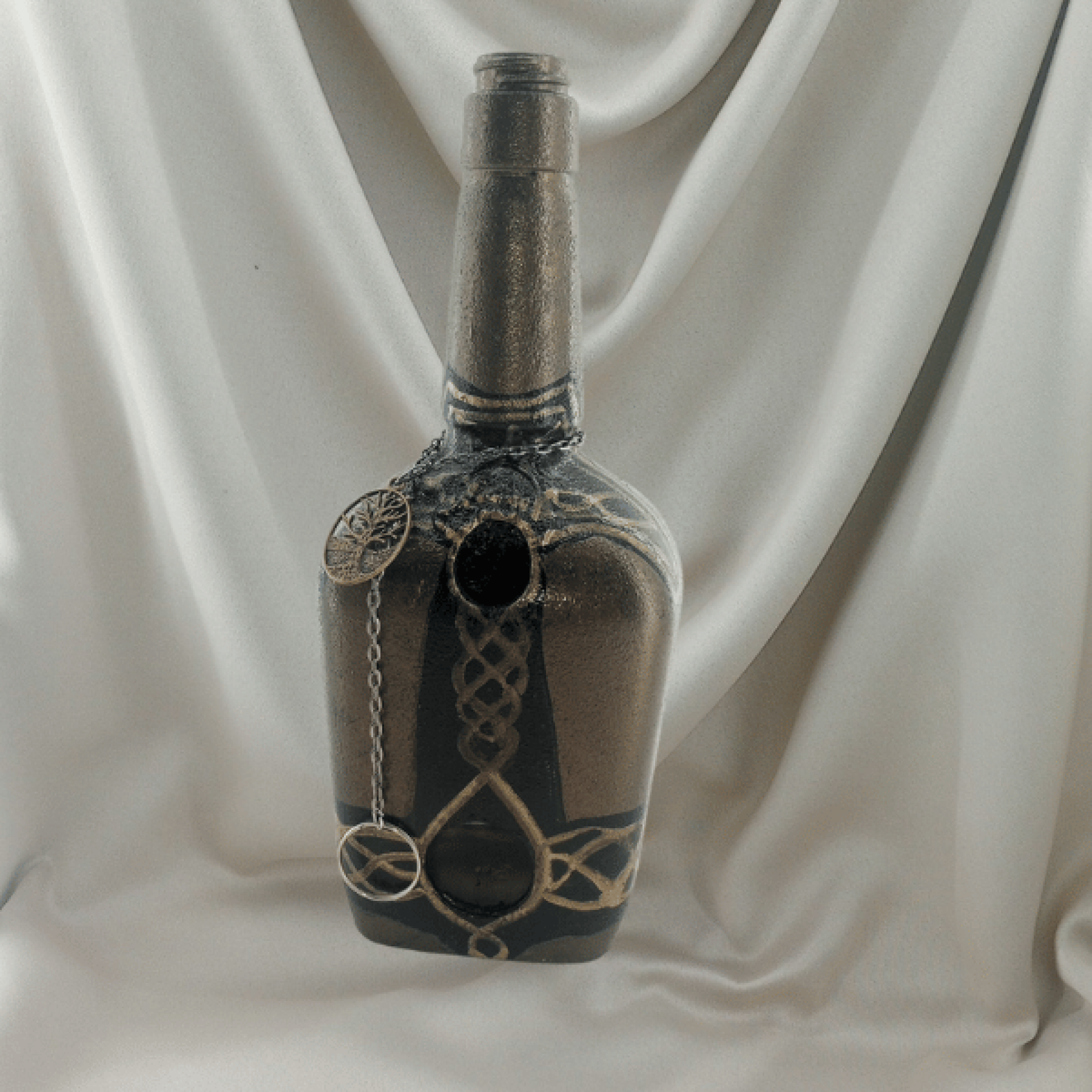 This particular bottle has been artistically designed with a faux metal effect complimenting the Norse theme. The front of the bottle is adorned with the hand painted Mythical Mjölnir, the Magic Hammer of Thor; also known as Viking symbol of thunder and lightning.