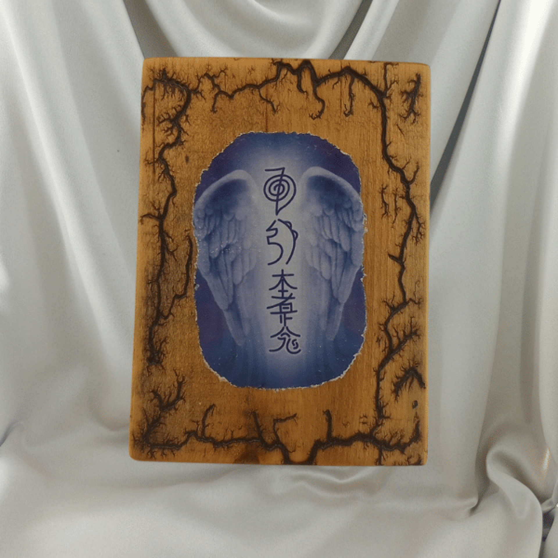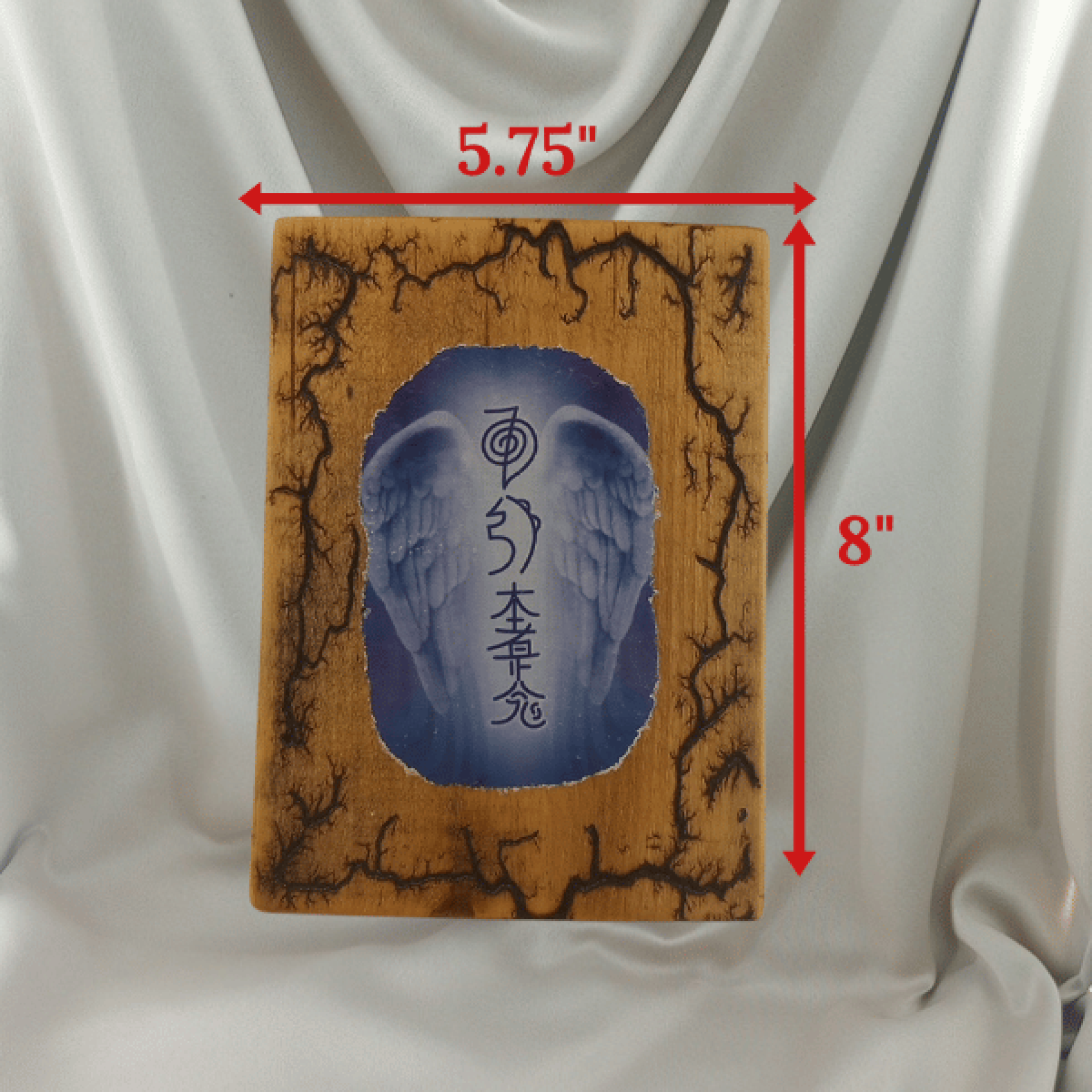 Angel Wings, Reiki Symbols 5.34" x 8" wood, plaque. It has been fractured burned and would look beautiful in your home.