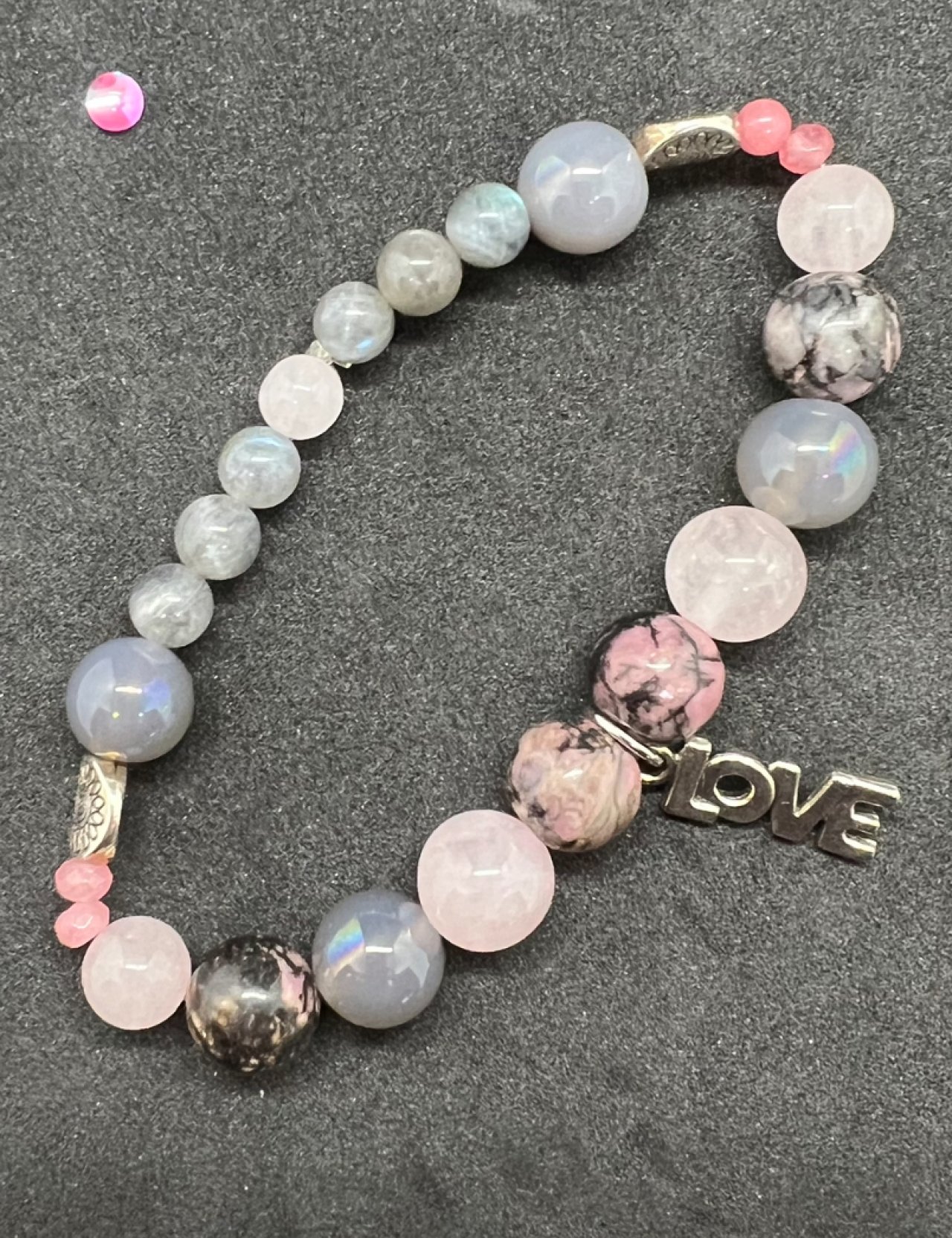 GEMSTONE BRACELET: BLACK LACE AGATE, GRAY MOONSTONE, ROSE QUARTZ GEMSTONE BEADS, PLUS THE WORD "LOVE" CHARM "
