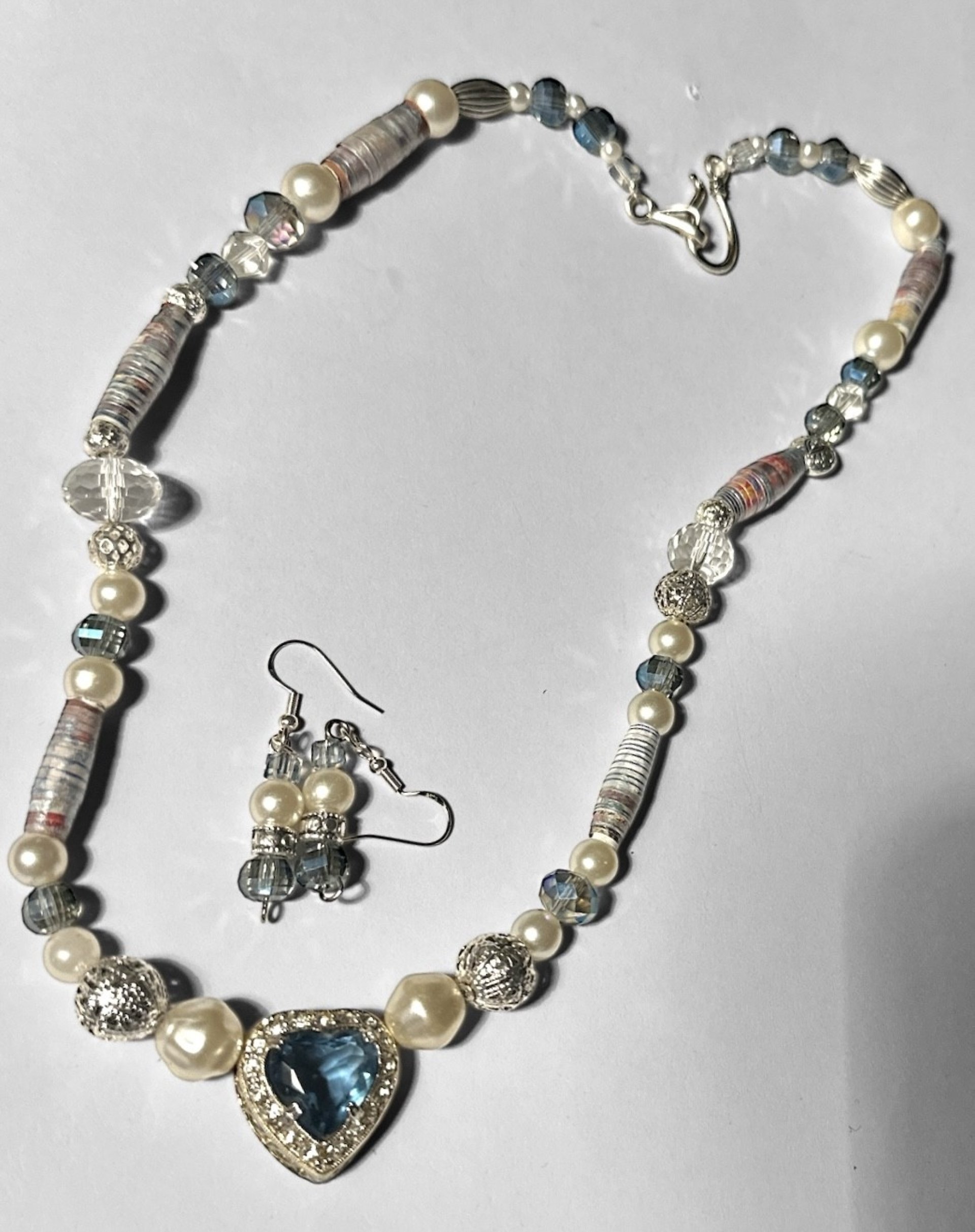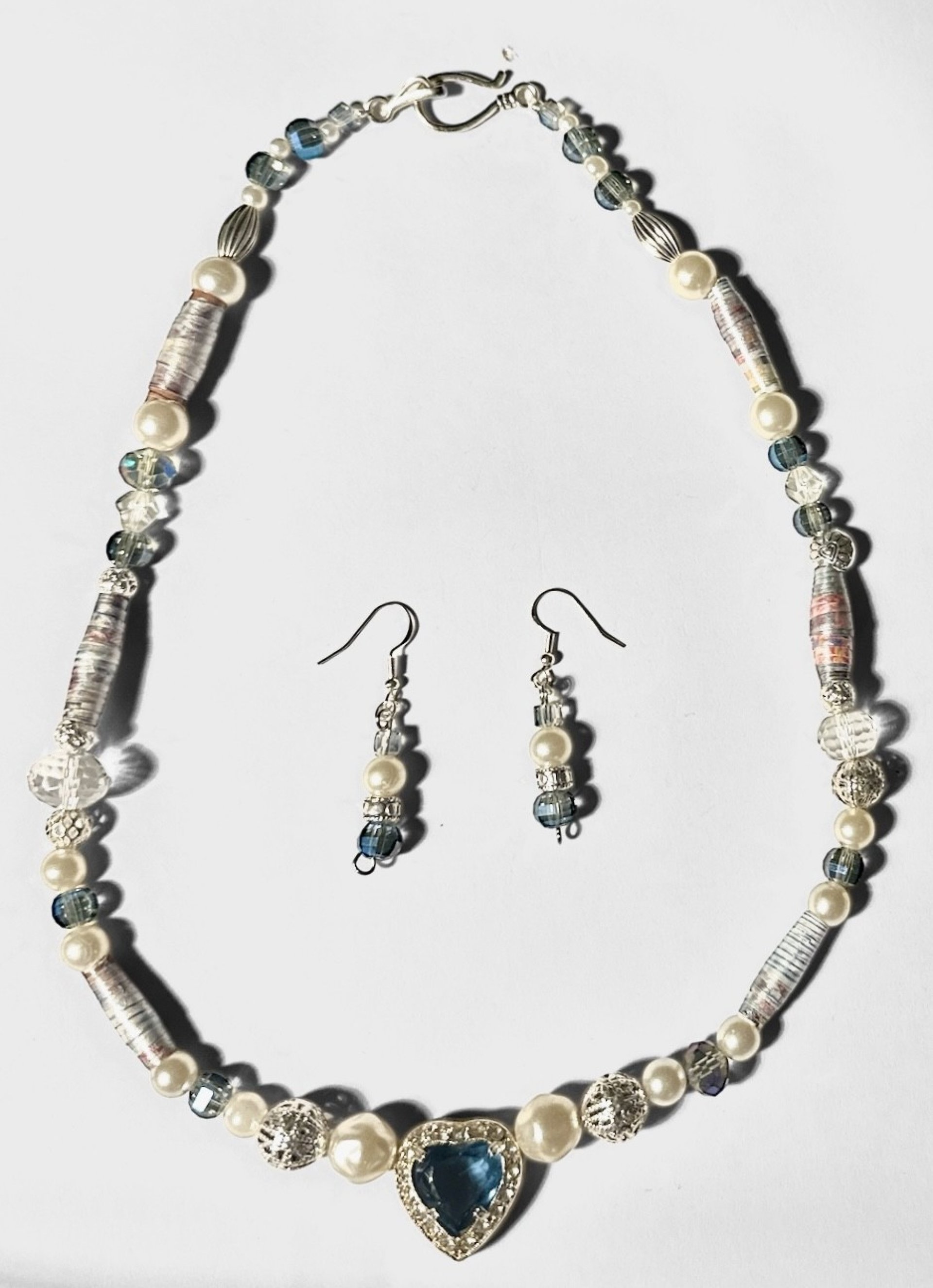 If you're a fan of "The Titanic" you're going to love this set! The crystal blue focal point is complimented by pearls and handmade paper beads that make this set really pop. The necklace measures 20". The earrings hang 1" from the bottom of hook and are hypoallergenic. FREE SHIPPING! Due to reasons of hygiene, this product cannot be returned.